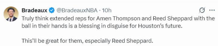 休媒还写道:火箭队的阿门、谢泼德在场上持球时做出过很多精彩的传球,对于休斯顿而言或许是一种意外之喜,塞翁失马焉知非福。这对阿门、谢泼德来说很好,尤其是对于谢泼德来说是一次巨大的利好。