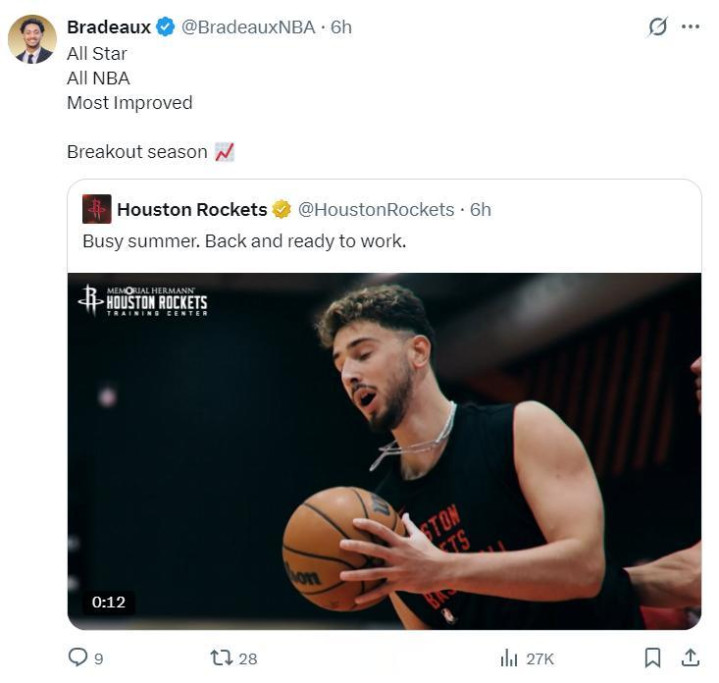 火箭队还有一个组织者那就是申京,申京用欧洲杯证明了自己是跟约基奇同类型的中锋,在范弗利特报销后他的高位策应战术会更多,休斯顿媒体认为新赛季申京会进入最佳阵容、全明星、最快进步球员。