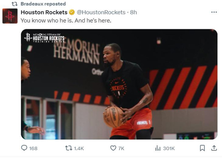 火箭队的训练营也已经开启,凯文-杜兰特穿上了火箭训练服在火箭训练场馆开始训练,杜兰特实际上也能承担一部分的组织任务,他是可以场均6+助攻的超级前锋。