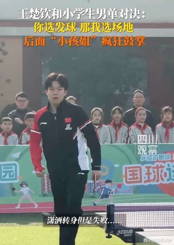 在王楚钦的单打环节,他与一位发育很好的小男生PF,目测这个小学生的身高已经超过了大头,王楚钦想要来一个拧拉华丽转身耍帅,但这一球却被小学生挡回来,可后面的小学生们还是不停为大头鼓掌。