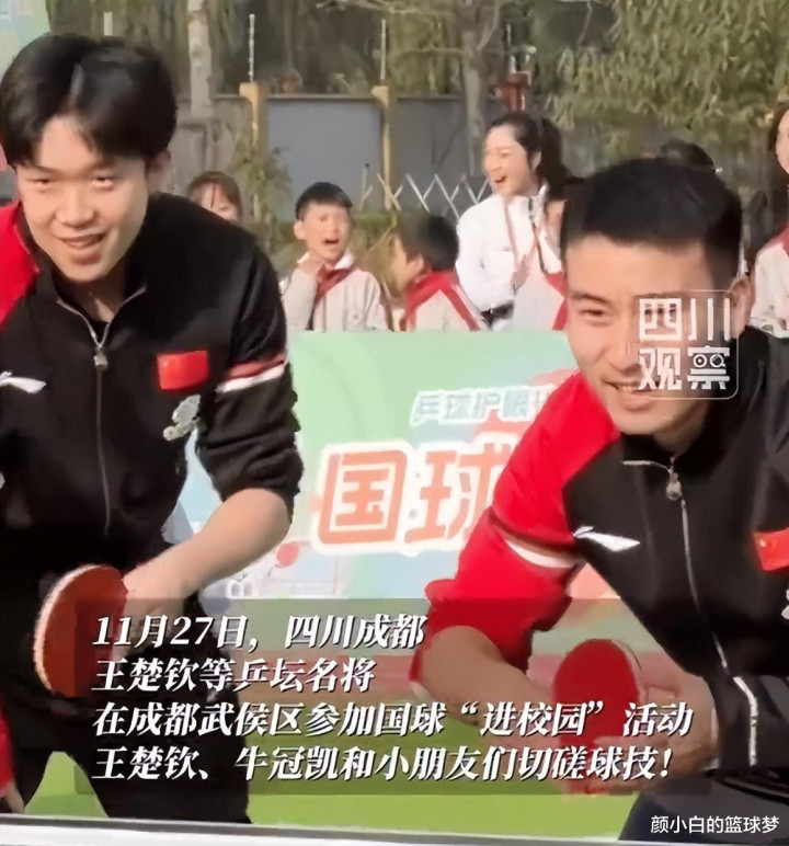 当天王楚钦、牛冠凯等人进入成都武侯区某所小学进行活动,可以看出大头非常开心,大头看着好兄弟跟小朋友PK连连丢分,他笑的非常开心。