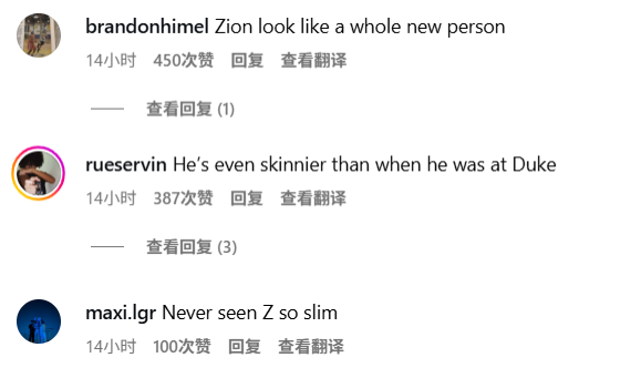 曾经联盟第一重的锡安,居然瘦到下颚线都出来了,实在让人惊讶,相关照片底下的评论观点也几乎一致: